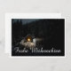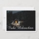 Die Karte zeigt eine stimmungsvolle, winterliche Szenerie mit einer kleinen, beleuchteten Holzhütte inmitten eines verschneiten Waldes. Die warme Lichtquelle im Inneren schafft einen schönen Kontrast zur dunklen, friedlichen Umgebung. Der elegante „Merry Christmas“-Schriftzug in Weiß verleiht dem Motiv eine festliche Note. 🎄✨