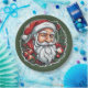 Sticker mit dem Kopf des Weihnachtsmanns und einem wunderschönen Weihnachtskranz. Digital erstellt, in farbenfrohem Cartoon-Stil.
