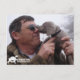 Cliff holds a six-week old Weimaraner puppy; it kisses him in the nose.