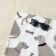 Cute Weimaraner dogs sit, stand and rollover with scattered dog bones and pawprints on a white background.