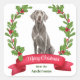 On these Holiday correspondence stickers, a watercolor image of a gray Weimaraner Dog is surrounded by a red berry holly wreath. At the bottom is a red banner with your custom Christmas greeting, and your signature is in green beneath it.