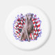 Flaunt your red, white and blue spirit with this Weimaraner and his patriotic background. Looks good for 4th of July, Memorial Day, Labor Day or ANY day on assorted apparel, buttons or hats.