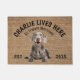 Weimaraner Personalized Dog lover welcome doormat. This welcome mat can be personalized with your dog’s name, the slogan can also be changed or you could use a picture of your own dog (make sure it's transparent). Text reads: Charlie lives here…. All treats welcome