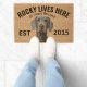 Weimaraner Coir Personalized Dog lover welcome doormat. This welcome mat can be personalized with your dog’s name, the slogan can also be changed or you could use a picture of your own dog (make sure it's transparent). Text reads: Rocky lives here…. All treats welcome.