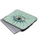 Blue eye laptop sleeve with a vector illustration of an abstract eye with make-up and beautiful long eyelashes. The eyelashes extend into dots and white and blue dots cover everything. The whole image is in shades of blue.