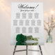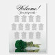 This 13 table wedding seating chart features a romantic and sophisticated design with a single long-stemmed emerald green colored rose lying on its side reflecting in a pool of water. It has space for 130 guests with 10 seats per table. The elegant script calligraphy title reads "Welcome! please find your table" and there is space for the names of the couple and wedding date at the bottom. Wonderful way to add beauty, class, and style to your wedding reception while making it easy for your guests to find their seats.