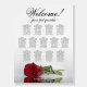 This 13 table wedding seating chart features a romantic and sophisticated design with a single long-stemmed red rose lying on its side reflecting in a pool of water. It has space for 130 guests with 10 seats per table. The elegant script calligraphy title reads "Welcome! please find your table" and there is space for the names of the couple and wedding date at the bottom. Wonderful way to add beauty, class, and style to your wedding reception while making it easy for your guests to find their seats.