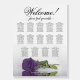 This beautiful 14 table wedding seating chart is romantic, elegant, and sophisticated. It has table assignments for 140 guests with 10 seats per table. The design features a single long-stemmed amethyst purple colored rose lying on its side reflecting in a pool of water. The fancy script calligraphy title reads "Welcome! please find your table" and there is space for the names of the couple and wedding date at the bottom. Great way to add beauty, class, and style to your wedding reception while making it easy for your guests to find their seats.