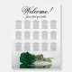 This stunning 15 table wedding seating chart features a romantic design with a single long-stemmed emerald green colored rose lying on its side reflecting in a pool of water. The elegant script title reads "Welcome! please find your table" with the names of the couple and wedding date at the bottom. This chart has space for 150 guests with 10 seats per table. Wonderful way to add elegance, class, and style to your wedding reception while making it easy for your guests to find their seats.