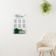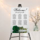 This beautiful 6 table wedding seating chart features a romantic design with a single long-stemmed emerald green colored rose lying on its side reflecting in a pool of water. The title is written in elegant script calligraphy and reads: Welcome! Please find your table. There is space for 60 guests with 10 seats per table, and the names of the couple and wedding date are shown at the bottom. Wonderful way to welcome your guests to your reception while helping them to find their seats.