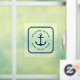 Window cling featuring a dark blue nautical anchor surrounded by a rope border and the text "welcome aboard" and your custom boat name.