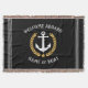 Keep warm and cozy wrapped in this nautical themed throw blanket with your personalized welcome aboard greeting and your boat name, family name or other desired text. It features a custom designed vintage boat anchor framed in gold style laurel leaves and star to complete the design. Comes in elegant black or easily change the primary color to match you current decor or theme.