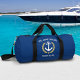 A custom designed nautical boat anchor, gold style laurel leaves and a gold star with "Welcome Aboard" and your personalized name or boat name on a stylish gym or travel duffle bag. This design is in white and gold colors on classic navy blue or edit the design and easily change the bag to any desired color. 2 bag sizes to choose from. Makes a great gift.