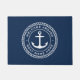 Door mat featuring a white, elegant anchor and rope emblem with customizable text "welcome aboard" and your boat name on a dark blue background.