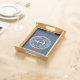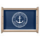Servlng tray featuring a white, elegant anchor and rope emblem with customizable text "welcome aboard" and your boat name on a dark blue background.
