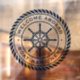 Window cling featuring a dark blue, elegant ship's wheel and rope emblem with custom text "welcome aboard" and boat name on a clear background.