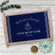 Welcome aboard, matey! Nautical Boutique Co.'s nautical welcome aboard serving tray cheerfully welcomes everyone aboard with boat name and home port. The background is navy blue and white and the accent stripes and hand-drawn anchor are white. #Nautical #BoatName #NauticalGifts #WelcomeAboard #031346