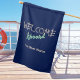 Welcome your crew and guests with this stylish nautical flag. In stylish navy blue, the flag displays the message 'Welcome Aboard' with a cool rope-effect font and elegant aqua script. Personalize the text underneath with your boat's name in fresh white lettering. The maritime look and positive message combine in a spirit of hospitality and adventure.