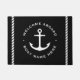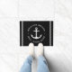 Door mat featuring a white nautical anchor and customizable text "welcome aboard" and your boat name flanked by rope borders. White design on black or custom color background.
