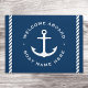 Door mat featuring a white nautical anchor and customizable text "welcome aboard" and your boat name flanked by rope borders. White design on dark blue background.