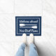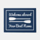 Welcome aboard custom name blue white boat paddles Doormat. Navy blue and white door mat / entry rug for home, boat, ship, school, dock etc. Elegant gift idea for sailor, sailing enthusiast, boat captain, skipper, fisher, dad, husband, friends, family etc. Trendy nautical silhouette symbol with fun quote. Also nice as beach home decor.
