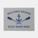 A beautifully inviting nautical theme doormat with welcome aboard and your personalized boat name, family name or other desired text. Features a custom designed boat anchor and crossed oars in navy blue on sea gray or easily customize the base color to match your current decor. Makes a great gift.