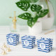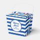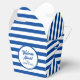 Welcome aboard nautical party favor boxes for boat trips, sailing excursions, on the water wedding parties, harbor club event and more. Personalized box for thanking guests. Custom message on the side. Modern blue and white stripe print with boat steer silhouette. Customizable background color. Nautical maritime theme design. Bucket shape with handle.