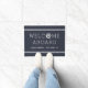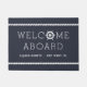 Welcome guests aboard your boat with this cool custom doormat featuring "welcome aboard" in white lettering with a ship's wheel in place of the "O." Personalize with your boat name and ship's registry beneath, on a deep navy blue background accented with white rope trim.