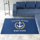 Personalize your boat, home or vacation spot with a nautical themed "Welcome Aboard" area rug with your personalized boat name, family name or other desired text. This unique custom design features a classic boat anchor complimented by regal, gold colored, laurel leaves and a gold star. The design is in white and gold colors on a navy blue base. The design also allows you to easily edit and customize the base and text colors as needed to match your current decor. Available in several sizes with options for indoor or outdoor use.