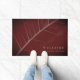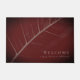 Modern decorative doormat features "Welcome" and address with simple a minimalist abstract macro leaf design in a burgundy and gray color palette