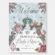 Welcome your guest to your very important baby shower with our unique original Alice in Wonderland tea party baby shower welcome sign. Our design features a tea party table setting with Alice sitting at the head of the table, along with the white rabbit, dodo bird, knave of hearts, and mad hatter party guests gathered around the table. The table has fun vintage-style teapots and teacups. The welcome sign details are beautifully incorporated into the table setting. Floral elements and rose blossom trees are arranged around the design to create a magical fairytale design. The reverse side features a beautiful two-monogram royal crown crest and floral design. Original artwork by Moodthology Papery