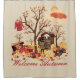Autumn and Fall scenery with old distressed haunted farm house and ghost set against golden rolling hills and autumn trees with yellow sun or moon with orange clouds and umbrella, kid in Halloween costume, Scary horror movie cinema screen, popcorn, movie tickers, harvest pumpkins, candy apples, mushrooms, fall leaves, football, fall and winter sweater and Wild Thanksgiving Turkey. Text reads: Welcome Autumn