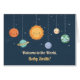 Welcome to the world, little newborn! This cute greeting card is great for sending your well wishes to new parents. It features cute doodles of a sun and various planets including Earth with cloud eye brows.