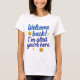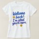 Stylish “Welcome Back! I'm Glad You’re Here” t-shirt with cheerful lettering, ideal for casual wear or reunions.