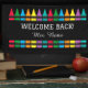 This colorful banner is a fun and festive way to welcome students back to school. The banner features a variety of crayon illustrations in bright colors, along with the words "Welcome Back" and the teacher's name.