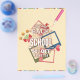 Welcome Back to School 50% Off Promotional sales flyer with a white typography. A modern, beige background with colorful, thin trim at top and bottom. Cute collage of picture shapes that are colorful and fun patterns in blue, pink and green. Other graphics include yellow flowers with a pink butterfly, and orange bird, a pink colored pencil, and a pink sideways heart.