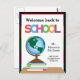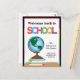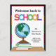 This back to school postcard features a graphic of a globe sitting on top of a stack of books. Multicolored text reads: Welcome back to SCHOOL. Customizable text allows you to add the teacher's name and school.
