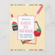 Cute, welcome back to school postcard with bottle of glue, pink pencil, red apple, and cute photo frames. Cute colorful borders at top and bottom. Typography "Welcome Back to School" with a template created for you.