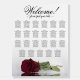 This beautiful 23 table seating chart features a modern floral design with a single long-stemmed burgundy, maroon, or wine red colored rose lying on its side reflecting in a pool of water. It has space for 230 guests at with 10 seats per table. The elegant script calligraphy title reads "Welcome! please find your table" with the names of the couple and wedding date at the bottom. Romantic, graceful, classy, and glam, this chart is a wonderful way add elegance and style to your wedding reception while making it easy for your guests find their seats.