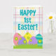 This card features a large turquoise message near the top, set in thick, easy-to-read lettering that marks a first-time Easter milestone. Behind it sits a soft plaid background with thin pink, yellow, and blue lines crossing over a white base, giving the scene a cozy spring feel 🌷. The design keeps the focus on the words while adding a gentle, homey texture, like a tablecloth laid out for a shared morning. Along the lower third, a row of pastel egg shapes rests together as if gathered close in friendly company, suggesting a sweet togetherness without showing faces 🐰. The eggs come in petal pink, sunny yellow, two shades of violet, and a calm teal egg with horizontal stripes. Most of the eggs are decorated with small lime-green flowers with bright yellow centers, adding tiny pops of detail. Bright green grass blades rise around the eggs in the foreground, and the striped teal egg stands out among the floral patterns.