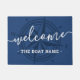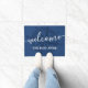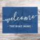 Dark blue or custom color welcome aboard door mat featuring the text "welcome" and your custom boat name on a blue background with a compass rose in a darker shade of blue