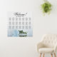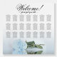 Add beauty, elegance, and style to your wedding reception with this gorgeous 21 table seating chart. The board has space for 210 guests with a traditional layout of 10 seats per table. The design is both romantic and beautiful, featuring a single long-stemmed pale dusty blue colored rose lying on its side reflecting in a pool of water. The fancy script calligraphy title reads: Welcome! Please find your, and there is space for the names of the couple and wedding date at the bottom. Wonderful way to welcome your guests while making it easy for them to find their seats.