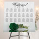 Add beauty, elegance, and style to your wedding reception with this gorgeous 21 table seating chart. The board has space for 210 guests with a traditional layout of 10 seats per table. The design is both romantic and beautiful, featuring a single long-stemmed emerald green colored rose lying on its side reflecting in a pool of water. The fancy script calligraphy title reads: Welcome! Please find your, and there is space for the names of the couple and wedding date at the bottom. Wonderful way to welcome your guests while making it easy for them to find their seats.