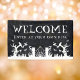 Black and white spooky Halloween party banner or welcome sign with the text "enter at your own risk". Featuring a haunted house door, scary trees with faces, cats, bats, a cemetery with tombstones, and a spiderweb background.