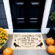 Fun spooky Halloween spirit board-inspired door mat. The Halloween door mat features a fun & creative design that resembles a spirit board. The spirit board letters spell out "Welcome Enter At Your Own Risk". The Yes and No, and numbers are incorporated into the design to resemble a spirit board. Spider webs and black crows add a stylish and spooky Halloween design. All illustrations contained in this stylish and spooky Halloween spirit board-inspired serving tray are hand-drawn original artwork by Moodthology.