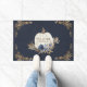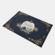 "Welcome Family Fall Pumpkin Foliage Blue Floral Front Door Mat." Welcome your family and friends with this lovely and elegant, fall foliage in navy and dusty blue floral design. A contrasting white pumpkin is set off by the rich dark navy quilted pattern background. The artwork was painted in watercolor by internationally licensed artist and designer, Audrey Jeanne Roberts, copyright.