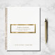 Modern guest book features a minimal design in white and gold. "Welcome" and custom address and guest book presented in simple font in a white window with a simple luxury brushed metallic gold frame.