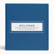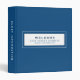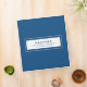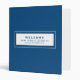 Modern guest information binder features a minimal design in a stylish blue and white color palette. "Welcome" and custom address and guest information subject presented in simple font in a white window with a coordinating frame.