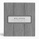 Modern guest information binder features a minimal design. "Welcome" and custom address and guest information subject presented in simple font in a white window with a coordinating frame on a stylish gray wood plank background.