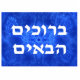 White Hebrew text reading, "B'ruchim Haba'im" (ברוכים הבאים - welcome) on a serene blue and white fractal image reminiscent of feathers or clouds. There is also a small Star of David (Magen David) in the center.